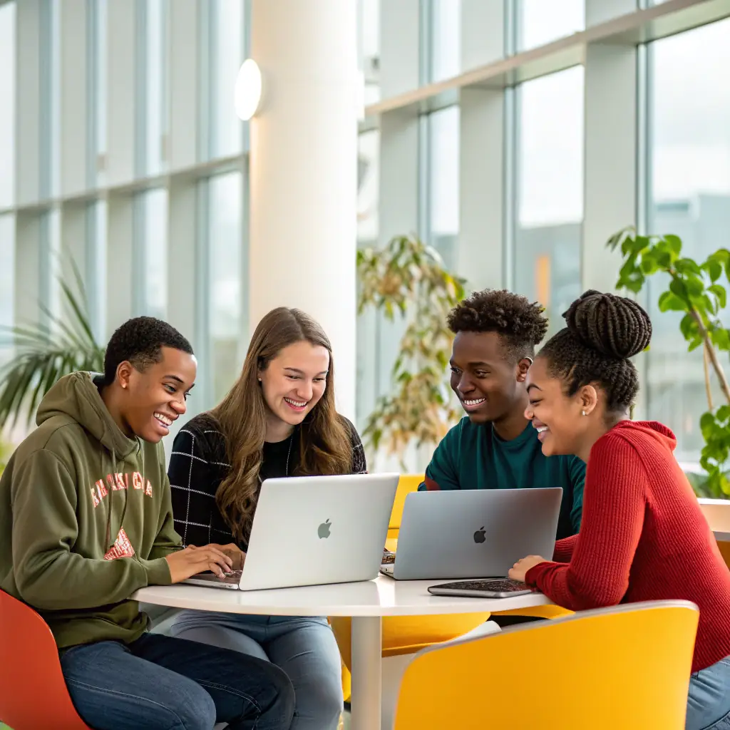 A diverse group of students collaborating on a web development project in a modern classroom setting, reflecting the collaborative learning environment at CodePulse.